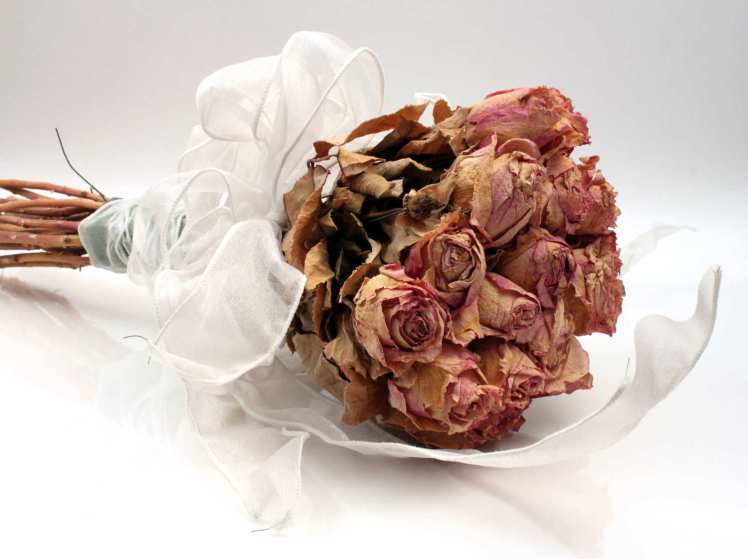 Wilted, dried up and faded roses taken out of the refrigerator